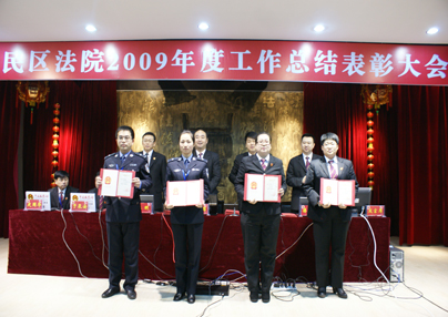 此次会议中的表彰决定、各类通报等所有会议内容全部通过设立在每位干警桌前的显示屏以及主席台前的大屏幕来显示。为创建“学习型、节约型、数字化”法院又向前迈进了一步。会上,对2009年度优秀庭室、优秀审判人员、先进工作者进行了表彰。最后,该院党组书记、院长王菲同志做了重要讲话,并要求在新的一年里进一步“强化公正意识,全面履行审判执行职能;强化和谐意识,努力践行司法为民宗旨;强化质量意识,全面加强审判管理工作;强化规范意识,切实抓好法院队伍建设;强化基础意识,稳步推进基础设施建设;强化服务意识,为辖区经济发展贡献力量;强化公开意识,全面加强庭审公开;强化监督意识,自觉接受人大监督”。