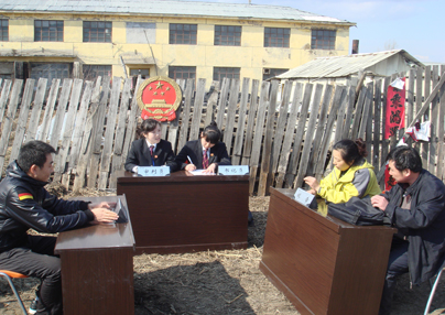 黑龙江省牡丹江市爱民区人民法院在深入开展“三项重点工作”中,将社会矛盾化解从法院延伸到了农家院,在辖区内的“七办一乡”设立了“法官工作站”,法官们脱下法袍、放下法槌,到乡村进行巡回审判,主动的将法律服务送到老百姓的身边。