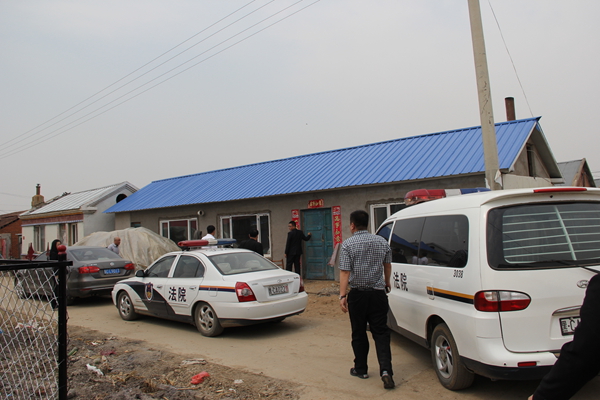 图为爱民法院干警与城乡联社工作人员到被执行人家中