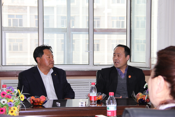 图为爱民法院院长卢俊成同志与城郊联社理事长张守辉同志交流意见