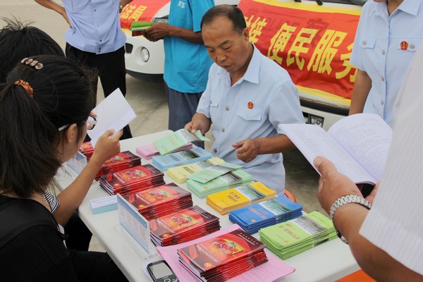 图为爱民法院干警为前来咨询的群众发放法律常识手册