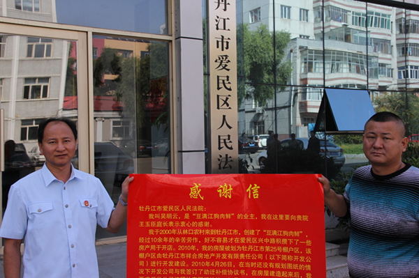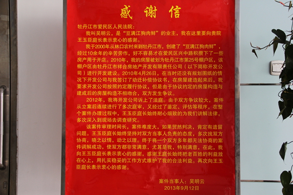 “豆满江狗肉鲜”饭店的经营者吴明云一桩心事终于了解了,清早就驱车前来看望王玉臣庭长并送来了自己亲手写的感谢信,表达自己对爱民法院秉公办理自己拆迁补偿案件,悉心调解,最终使双方圆满和解的谢意。