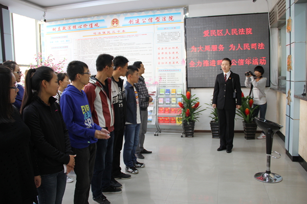 在讲解员王丽丽的带领下啊,师生们先是来到了爱民法院的诉讼服务中心,观看立案大厅的宣传栏板,了解立案的各个流程和诉讼文书的填写。在观看完一个案件的完整立案流程后,师生们来到爱民法院第六公判庭观摩庭审。整个庭审过程两所高校的师生表现出极高的素质和热情,时不时的用笔记录自己不太理解的地方,聚精会神的关注法官提问的每一个细节。庭审持续了一个小时,法槌刚一落下,审判长宣布休庭时,就有同学举手示意有不解的问题,随后,审判长张颖为他们作了耐心细致的解答。随后,政工科副科长刁春国同志向师生介绍了法院的基本情况,负责本次开放日活动的党组成员、纪检组长李菲同志作了简短的讲话。