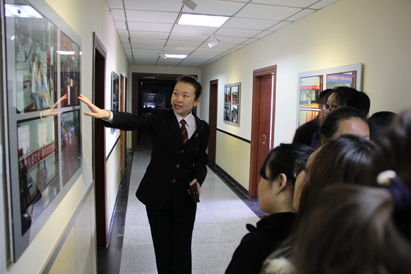 庭审观摩结束,一行人又来到了爱民法院文化长廊,在解说员生动而富有激情的讲解下,师生们对法院文化建设赞不绝口,同时获取了很多爱民法院历史沿革的信息,大家都认为爱民法院在文化建设方面做了很多的工作,并且有自己的风格和特点,很值得学校借鉴和参考。