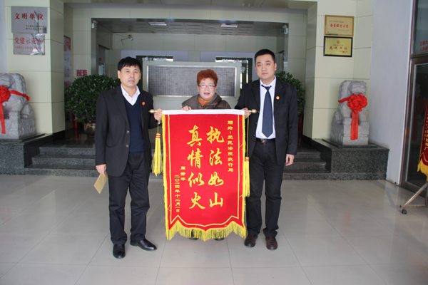 牡丹江市爱民区法院以司法为民的工作作风,切实肩负起推进依法治国实践者的神圣使命,紧紧围绕“让人民群众在每一个司法案件中都感受到公平正义”扎实开展审判执行工作,以执法为民的实际行动为当事人排忧解难,得到当事人的一致好评和广泛认可。图为当事人为爱民区法院执行局法官送锦旗以表感谢之情。
