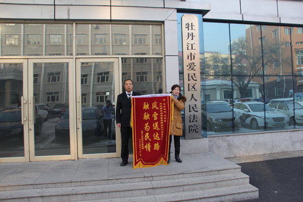 冬雪漫漫天盖地,融融真情暖民心。为了“让人民群众在每一个司法案件中都感受到公平正义”,牡丹江市爱民区人民法院立案送达人员考虑到当事人年事已高、体弱多病的实际情况,顶着刺骨寒风,在大雪纷飞导致封路的情况下,徒步三十余里,圆满地完成了送达任务,得到了当事人的一致好评,提高了群众满意度,提升了司法公信力,为全院法官切实践行司法为民的核心理念、努力打通服务群众的“最后一公里”作出了榜样。图为当事人子女为立案送达人员送锦旗表达感谢之情。