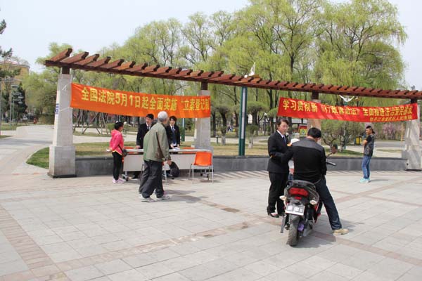 为推进“立案登记制”和新《行政诉讼法》5月1日全面实施,进一步提升人民群众知法、懂法、遵法、守法的法律意识和法律素养, 4月30日,牡丹江市爱民区人民法院青年法官们在辖区公园组织开展了一次别开生面的普法宣传活动。