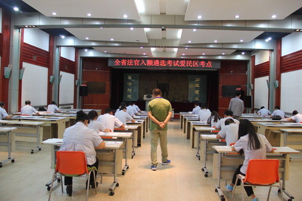 9月3日9时,爱民区法院法官入额遴选笔试考试准时开始,全体考官、监考人员入场,考生凭准考证、身份证按指定位置就座。此次考试试题内容由黑龙江省高级人民法院委托第三方命题、评卷,采取闭卷形式进行,考试过程全程监控、全程录像、全程留痕。