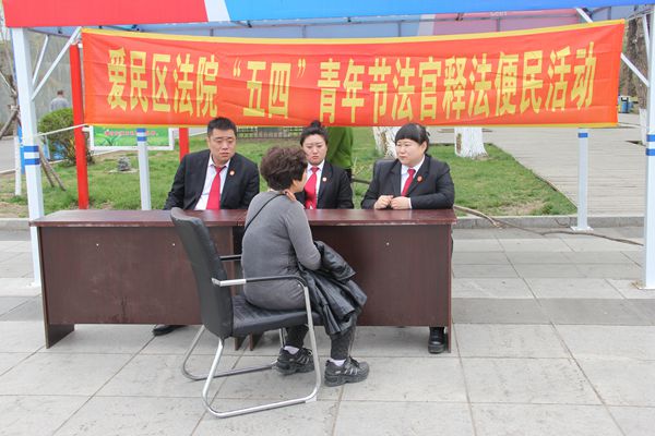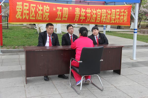 5月4日下午14时,爱民区法院青年干警整装齐发,前往北山公园开展“五四”青年节法官释法便民活动。五月的天晴空万里,青年干警意气风发、斗志昂扬,以饱满的热情投身于人民群众中、投入大自然的怀抱中。活动现场搭建法官释法答疑平台,悬挂普法宣传条幅,长期从事审判工作的一线法官对群众提出的立案流程、诉讼时效、借贷纠纷、婚后财产分割、行政诉讼、执行返款等相关法律问题进行了细致解答,建议群众在生活中关注法律、学法、懂法、用好法律的武器保护自身合法权益,遇到法律问题要及时拔打爱民区法院诉讼服务热线12368或者登陆网上诉讼服务中心。