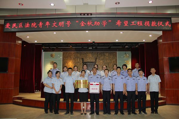 金秋助学献爱心,捐款捐物助学子圆梦。爱民区法院“青年文明号”率先垂范,举行金秋助学捐款仪式,带头为希望工程贫困学子捐款捐物,助力品学兼优的学子插上圆梦翅膀,奔向锦绣前程。