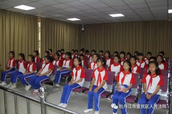 在爱民区法院科技法庭——第六公判庭,五十余名小学生进行了现场模拟庭审。小学生“法官们”身披法袍,走上审判台,模拟庭审现场。小法官们表情严肃,态度认真,位列原告、被告席的“小当事人们”在庭审中也都对答如流,整个庭审活动进行有序,严谨庄重。模拟庭审结束后,带队教师说:“这样的法治教育活动非常有意义,从小培养了孩子们的法治精神和法律意识。”