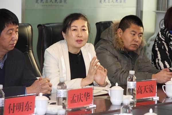 “今天走进法院感触最深的有两点,一是咱们法官办案非常认真,二是取得的荣誉很多,足以说明咱们法院工作走在全市法院前列。重要的成绩在于第一是能把执行工作作为17年的重点工作,破解执行难,敢于攻坚克难,对于社会上的老赖起到了震慑作用,社会影响非常大。第二是法官普法工作做的好,深入社区、企业、医院等地开展普法宣传,直接影响到大家今后遵法守法的法治意识提升,教育意义很显著。我提几点建议,一是涉及到百姓生活中的小案件,把这样的案子办好,通过媒体报道出去,普法教育意义更深远。走到老百姓身边去,往往这些百姓身边发生的小事最能影响城市和周围环境文明程度。二是如何让百姓感受到公平正义,在于建立诚信机制和诚信系统,让大家感受到法律面前人人平等,社会环境才能有所改善。这些事情可能很小,但是小事做好非常不容易,只有把小事做好了,工作上才能有进一步提高。希望咱们爱民区法院能够把和百姓息息相关的小案件审理好,取得的成绩能够在全省工作报告中写上浓重的一笔。这就是我的个人想法和提出的意见建议。”孟庆华结合法治宣传和普法工作提出了自己的意见建议。