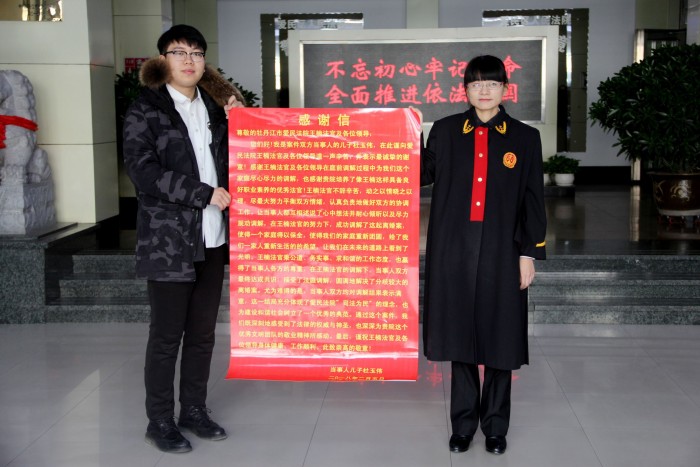 “感谢王楠法官设身处地为当事人考虑,努力调解了这起离婚案,挽救了一个家庭,给我们一家人重新生活的希望,作为当事人双方的家属,此次来到爱民区法院就是特意送来我们全家对王楠法官的感谢信。”说话的不是别人,正是当事人双方的儿子杜某。