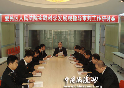 为适应十七大提出的新思想、新任务和新要求,满足人民群众对法院工作的新期待,更好的结合审判工作实际情况,深入贯彻落实科学发展观,11月7日上午,在精心组织、周密筹划之下,黑龙江省牡丹江市爱民区人民法院在党组书记、院长王菲同志的亲自组织下,召开了实践科学发展观指导审判工作研讨会,从而拉开了该院深入学习实践科学发展观活动的序幕。在今后一段时期,该院将本着“不缺一课,不落一人”的原则,高质量地开展深入学习实践科学发展观活动。在研讨会上王菲院长对开展活动提出了“学”、“验”、“思”、“改”的具体要求。