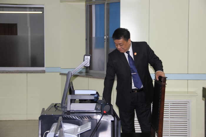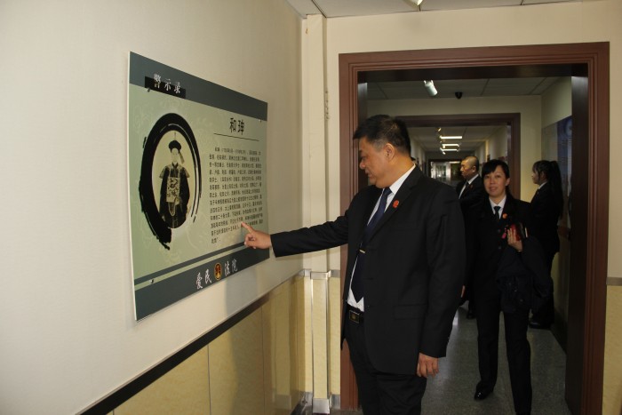 刘振刚组长与谢永魁主任先后就诉讼服务中心、司法警察大队、数字化法庭、羁押室、执行警务局建设等工作进行了实地调研,详细了解了爱民法院各部门的职能、设置、设施情况。