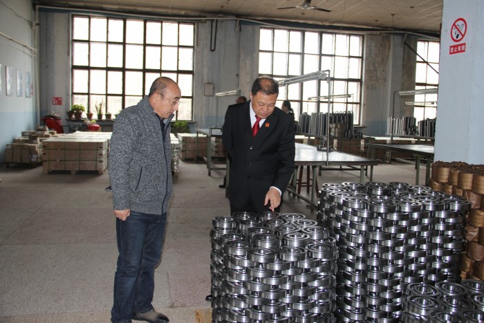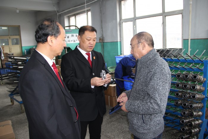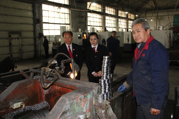 走访中,爱民区法院院长李刚、副院长王玉臣及民二庭庭长郭红波一行深入辖区企业牡丹江轴承制造有限责任公司进行深入走访,坚持以企业满意为出发点和落脚点,通过走访企业车间、生产线,观察询问生产工艺和轴承加工制作流程,与企业负责人商世权总经理和王力远销售经理进行座谈,进一步深入了解企业发展现状,及时掌握企业实际需求和制约企业发展的涉法问题,当场就企业涉诉涉法问题进行了一一解答,为企业发展提供便捷的司法服务。