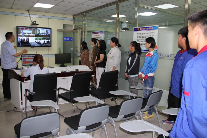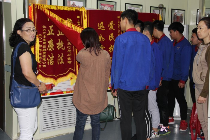 第一次走进法院大厅,师生们不禁四处环顾,墙面上雕刻的法院院训深深地吸引了师生们的注意。在爱民区法院党组成员、政工科长刁春国的引导下,春雨心理咨询师培训学校的朱双红老师及学校师生先后参观了法院的司法警察大队警务指挥中心、科技法庭、执行指挥中心、文化长廊等场所,并旁听了一起民事案件庭审。
