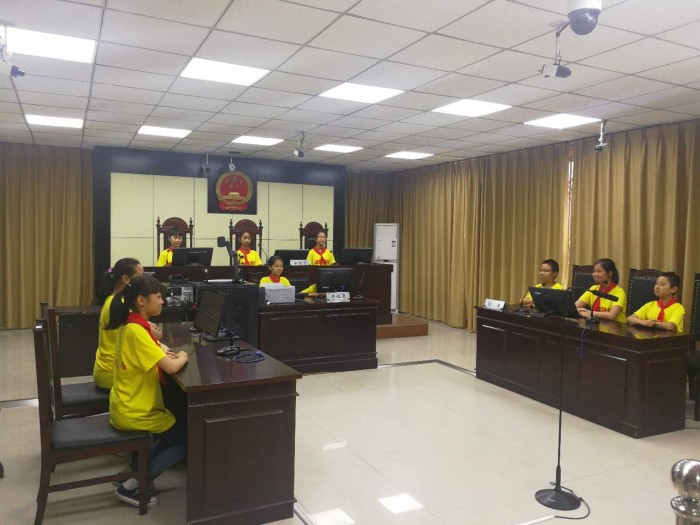 师生们驻足科技法庭,详细了解了法庭纪律和信息化建设,听完讲解员对审判席、原被告席的介绍后,同学们跃跃欲试,纷纷表示希望亲身体验法律的威严与庄重,得到允许后争先恐后地坐到审判席和原、被告席上,扮演起法官和当事人,“小法官们”身板挺直、气宇轩昂,一身威严正气。“小当事人”把脸颊凑近麦克风,似乎要做法庭辩论,双方各不相让,气氛严肃活泼。