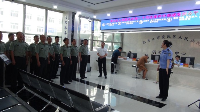 中国人民解放军建军91周年来临之际,牡丹江市爱民区人民法院第47次法院“公众开放日”迎来了我们最可爱的人。8月1日上午,牡丹江军分区副司令杨延江、动员处处长商成国、政治工作处主任何海敏等一行30余人,在爱民区法院党组书记、院长李刚的陪同下走进法院,零距离了解法院文化,感受法治氛围。