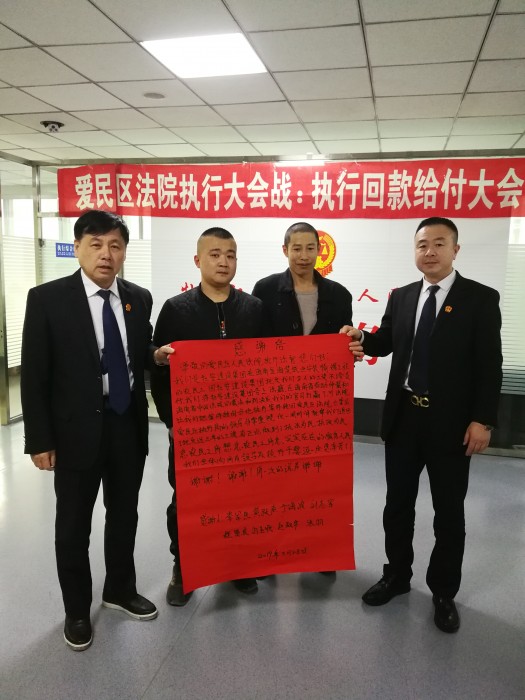 2019年3月21日,武某等8名农民工向爱民区法院申请强制执行,执行局长史国华在审查了解案情之后,非常重视,立即找到了被执行人黑龙江某建设集团有限公司的相关负责人,由于此工程系挂靠企业所为,该集团负责人不愿承担所欠民工工资,经过一番耐心的释法明理后,其负责人当即表示主动履行生效裁决书确定的义务。三日后被执行人黑龙江某建设集团有限公司主动将全部执行款转到法院帐户。申请人得知这么快就执行回来了,简直不敢相信这是真的,虽然钱并不多,但是对于农民工来说,这是他们的血汗钱,为了感谢爱民区法院执行人员,8名当事人送来了感谢信,爱民区法院用实际行动践行省法院提出的“打官司不求人”的庄严承诺,做到立案快、执行快、放款快,真正维护老百姓的合法权益,提升人民群众对法院工作的满意度。