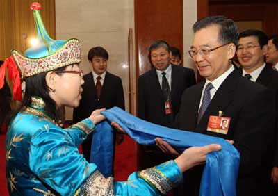 10日上午,温家宝总理在人民大会堂参加内蒙古代表团审议。来自通辽市奈曼旗明仁苏木一个普通小村庄——保安村的农民代表顾双燕一段朴实的开场白,拉开了与总理之间的对话。