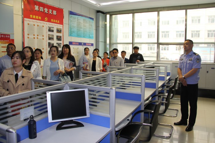 驻足法院诉讼服务中心——法院第五党支部,伴着讲解员娓娓动听的声音,党务工作者详细了解了爱民区法院的机关党建工作。