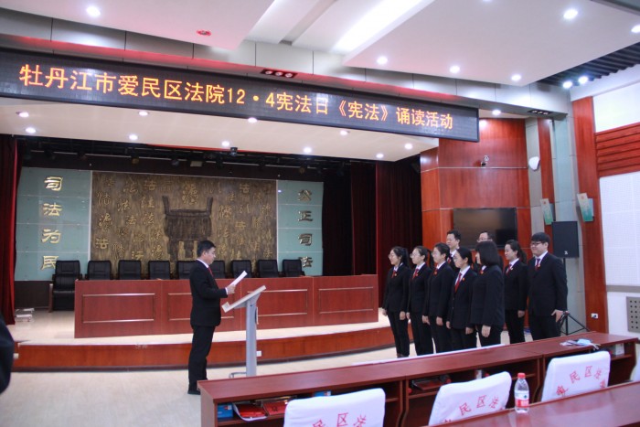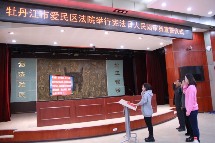 “我宣誓:忠于国家,忠于人民,忠于宪法和法律,依法参加审判活动,忠实履行陪审职责,廉洁诚信,秉公判断,维护社会公平正义!”12月4日,爱民区法院举行宪法日人民陪审员宣誓仪式,新选任人民陪审员在谌雪燕同志的带领下,面向宪法,列队站立,右手握拳,庄严宣誓,作出神圣而铿锵有力的承诺。