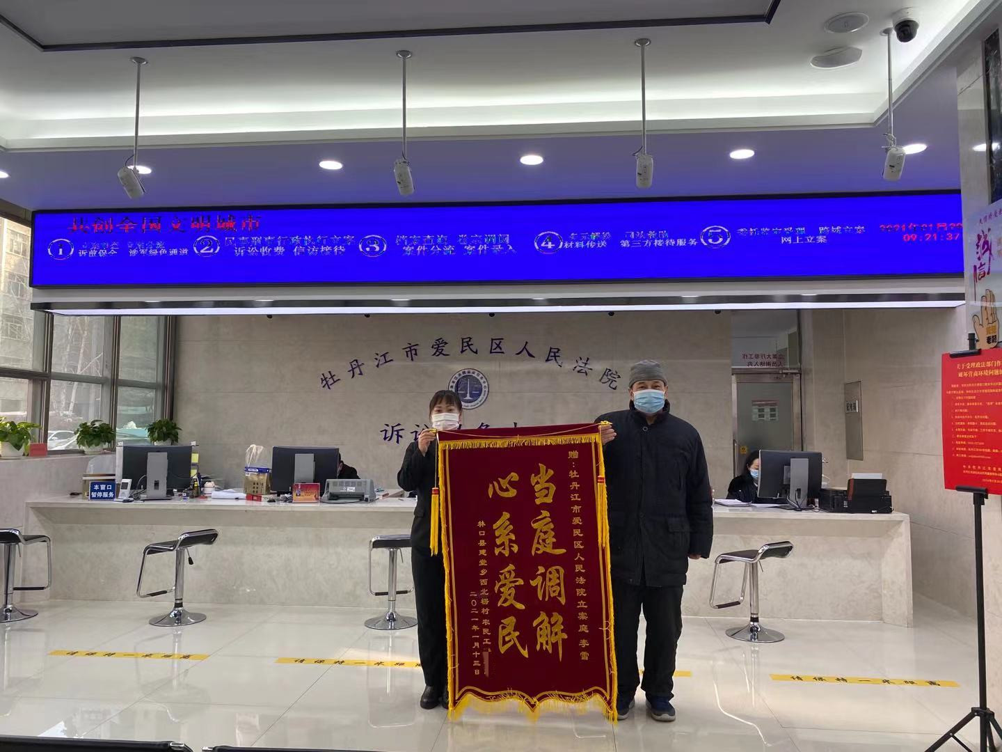 当事人为感谢办案法官,为法官送来了写有“当庭调解 心系爱民”的锦旗。