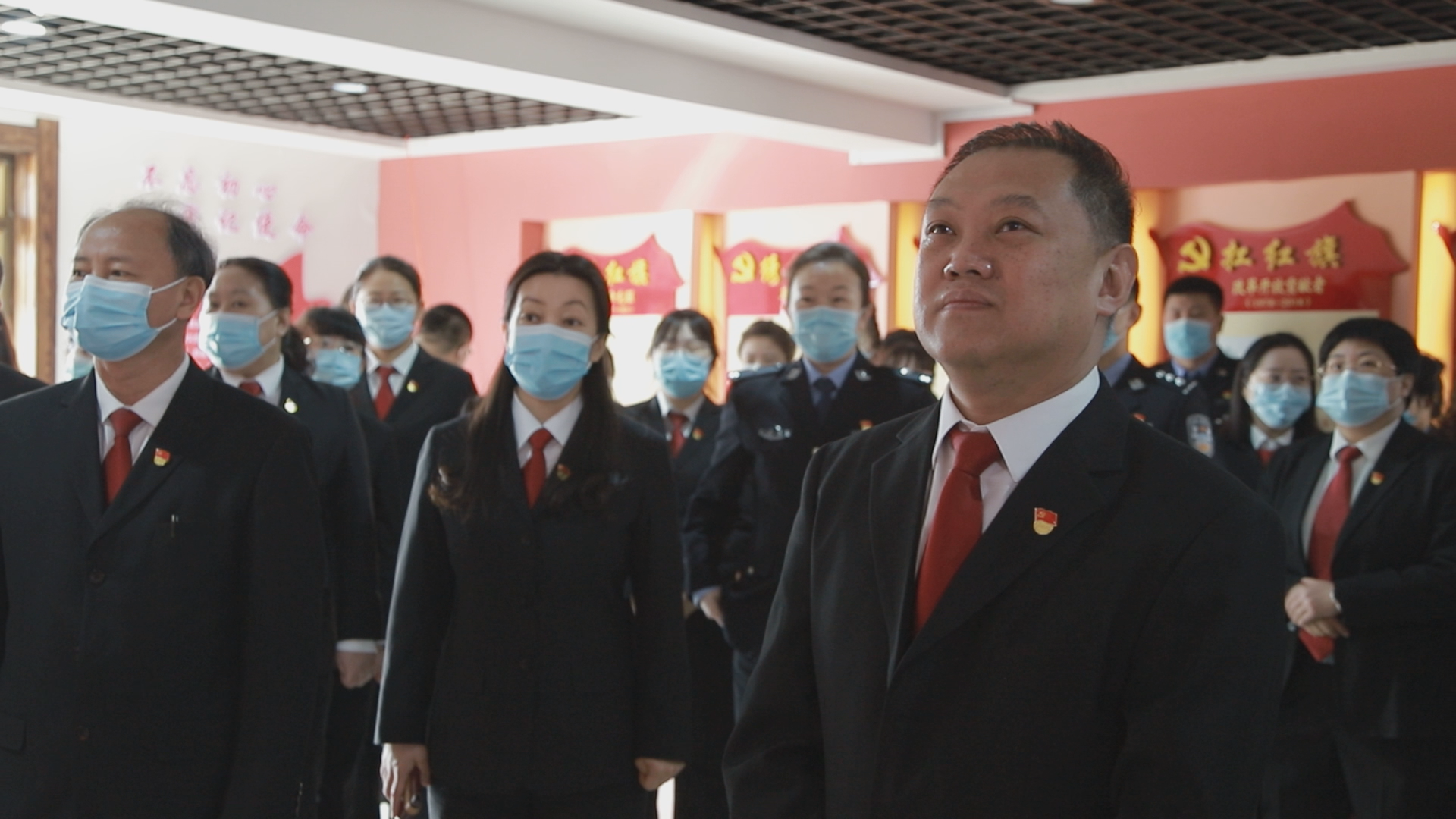 参观结束后,在爱民区法院党组书记、院长李刚的带领下,参加活动的党员干警向党旗重温入党誓词,党员干警们举起右手,握紧拳头,跟随李刚院长作出了庄严宣誓:“我志愿加入中国共产党,拥护党的纲领,遵守党的章程……”肃穆的表情、铿锵的誓言,表达了法院党员干警对党的无限忠诚。