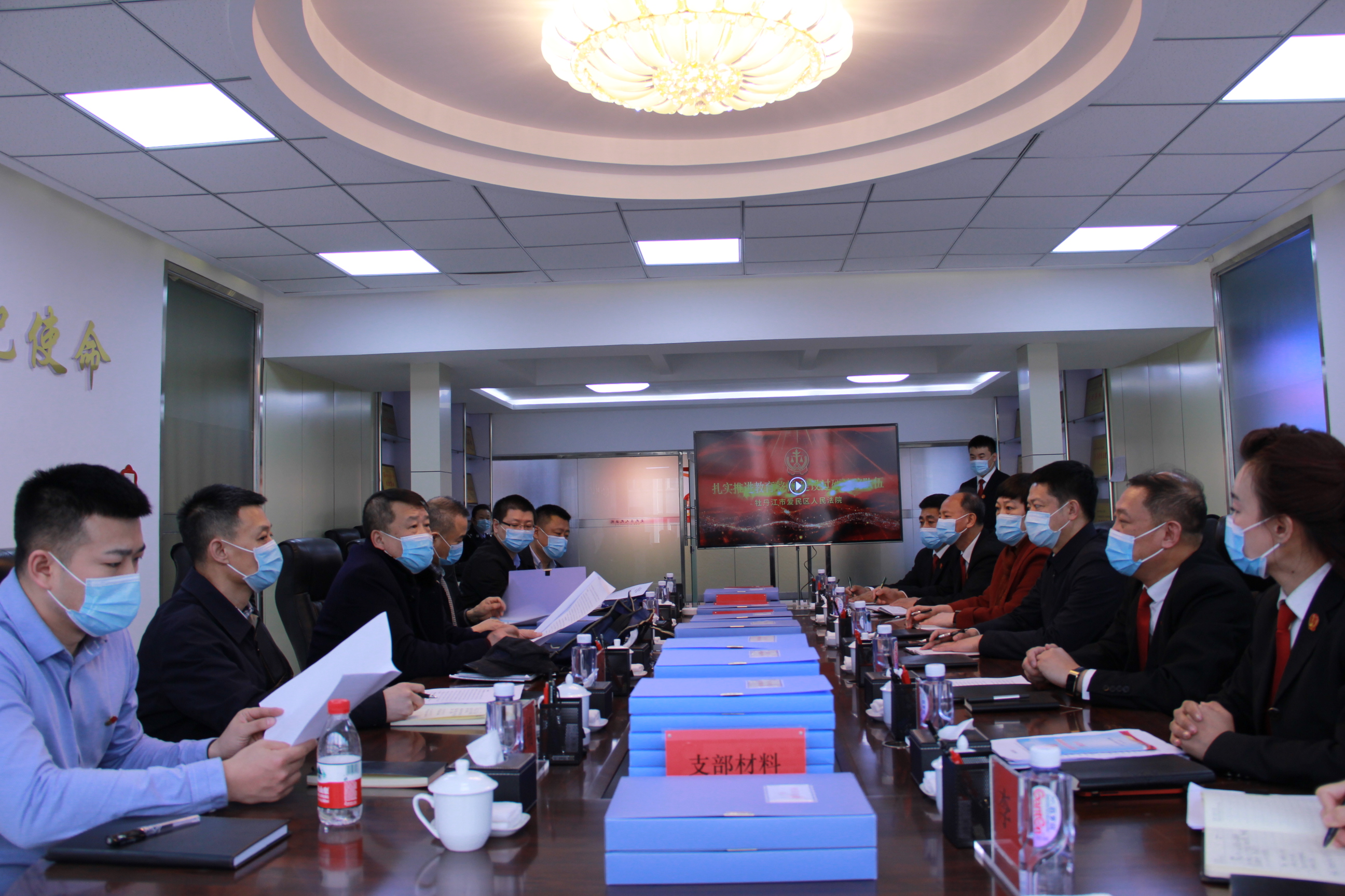 3月22日下午,省政法队伍教育整顿第三指导组副组长王家男一行5人到牡丹江市爱民区人民法院指导队伍教育整顿工作,区委副书记赵鑫、区政法委副书记李云伟、爱民区法院党组书记、院长李刚,以及其他党组班子成员陪同检查。