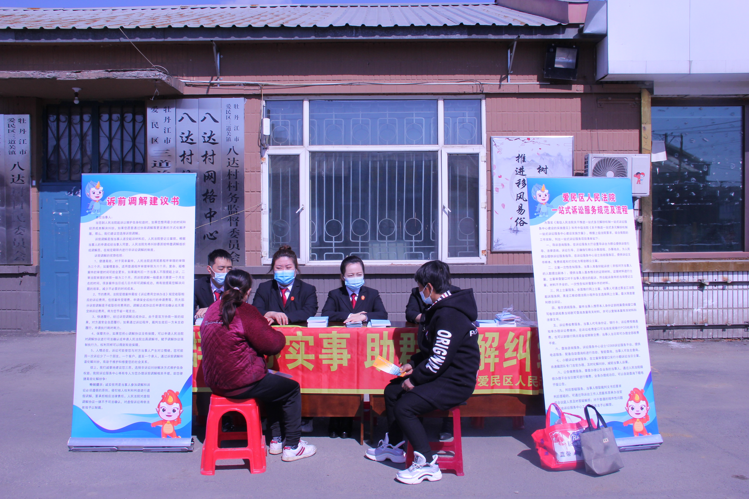 为更好满足人民群众司法需求,提高村民的法律知识和维权意识,4月9日,牡丹江市爱民区人民法院立案庭组织速裁法官及干警到爱民区三道关镇八达村进行普法宣传,为群众提供法律咨询服务。