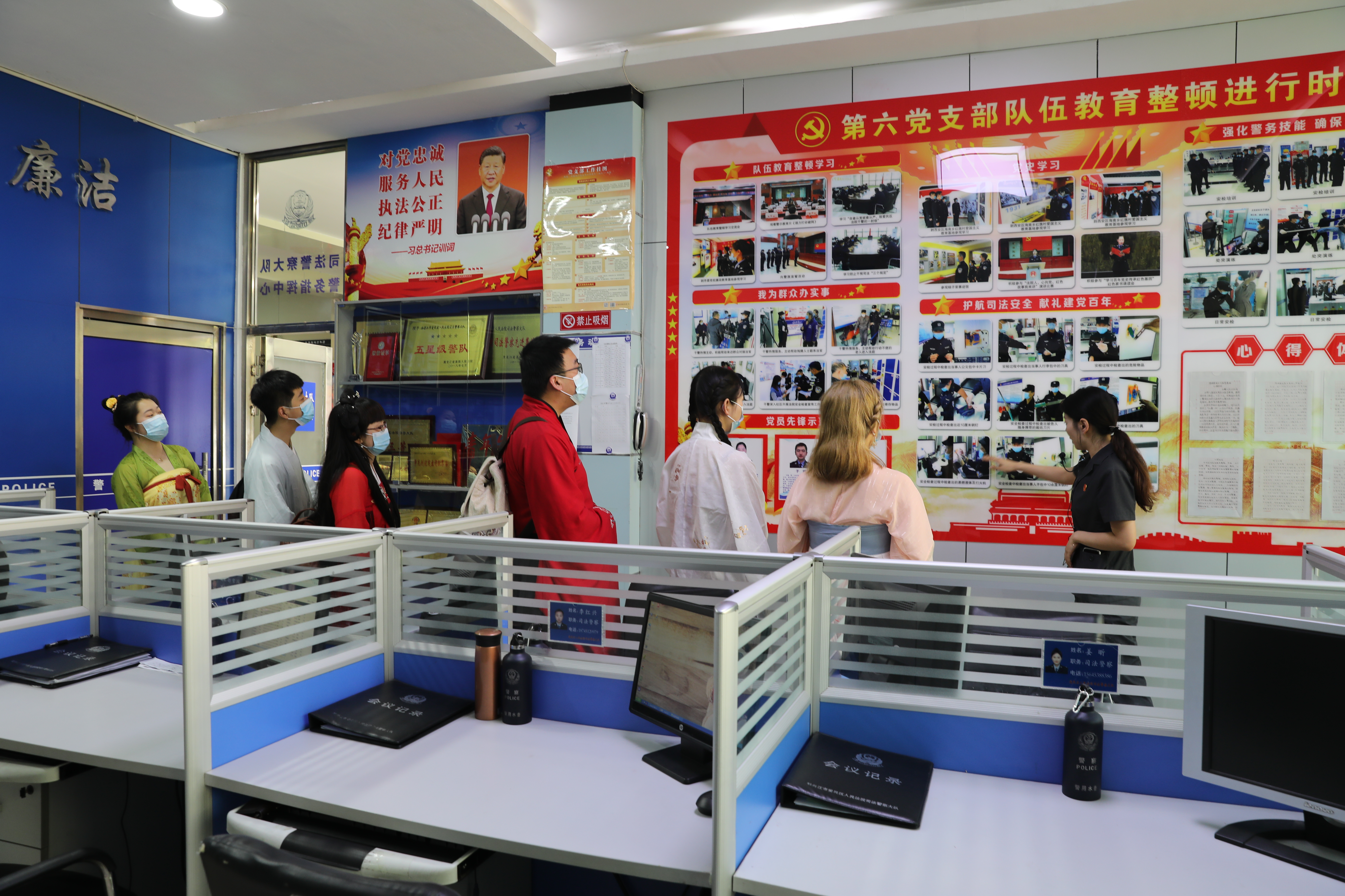 跟随着讲解员的脚步,身着各色汉服的社员们依次参观了法院诉讼服务中心、司法警察大队警务指挥中心以及审判法庭等办公场所。了解法院工作常态,在审判法庭,社员们还走上法台、坐上法椅、拿起法槌,感受司法的庄严。