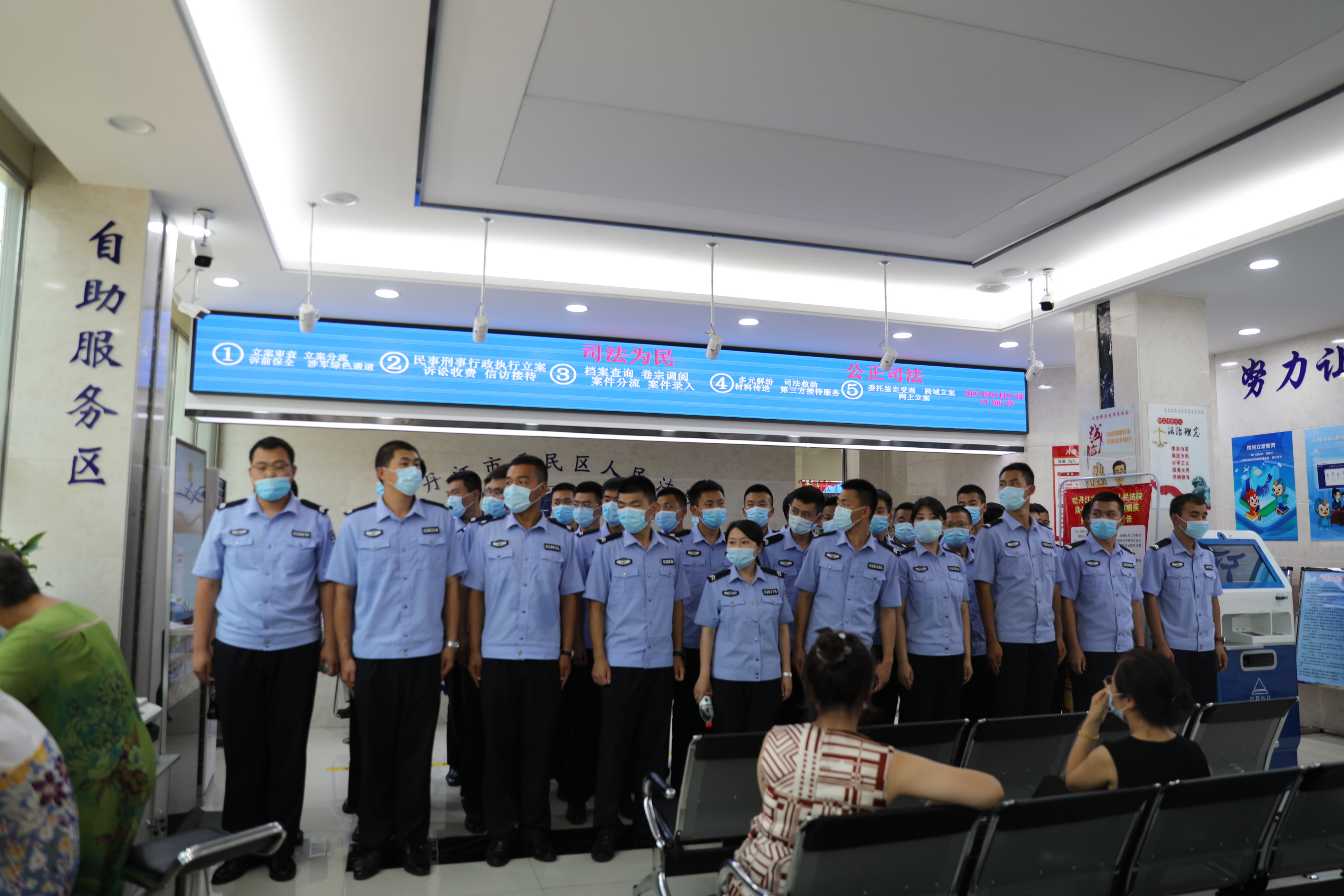 在讲解员的带领下,新入职民警们参观了法院的诉讼服务中心、司法警察大队警务指挥中心、家事审判法庭以及科技审判法庭等地,对法院队伍教育整顿、党史学习教育、文化建设以及司法为民情况进行深入了解。