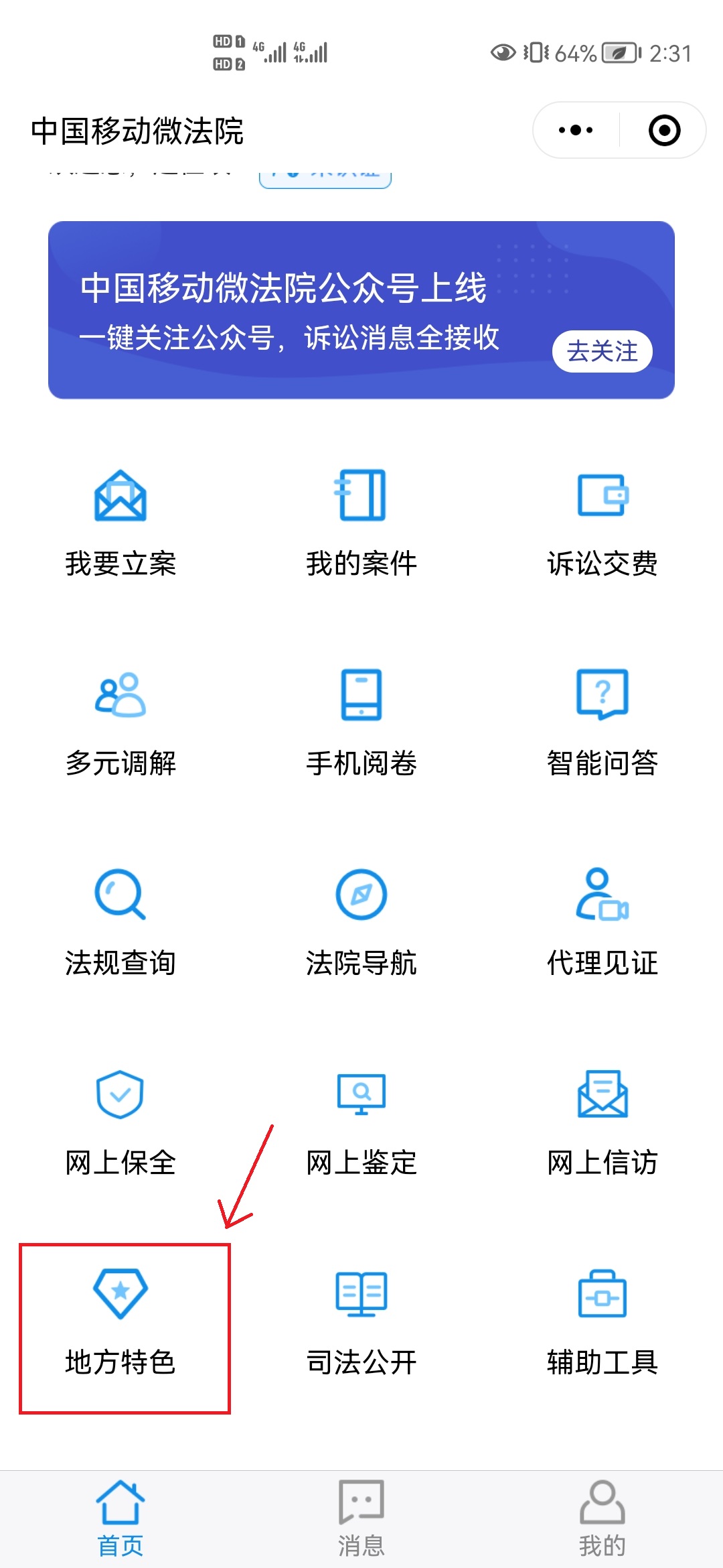 登录后,点击首页左下角“地方特色”,选择“我的评价”,点击跳转至评价列表页面,用户在待评价列表中选择案件,跳转至“我要评价”页面,进行勾选评价即可。