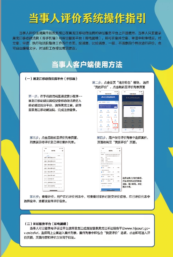 为践行“打官司不求人”庄严承诺,切实提升人民群众司法满意度,黑龙江省法院研发了“当事人评价法院案件质效系统”,并在黑龙江移动微法院和诉讼服务平台上予以开通。现将“当事人评价法院案件质效系统”操作方法介绍如下:
