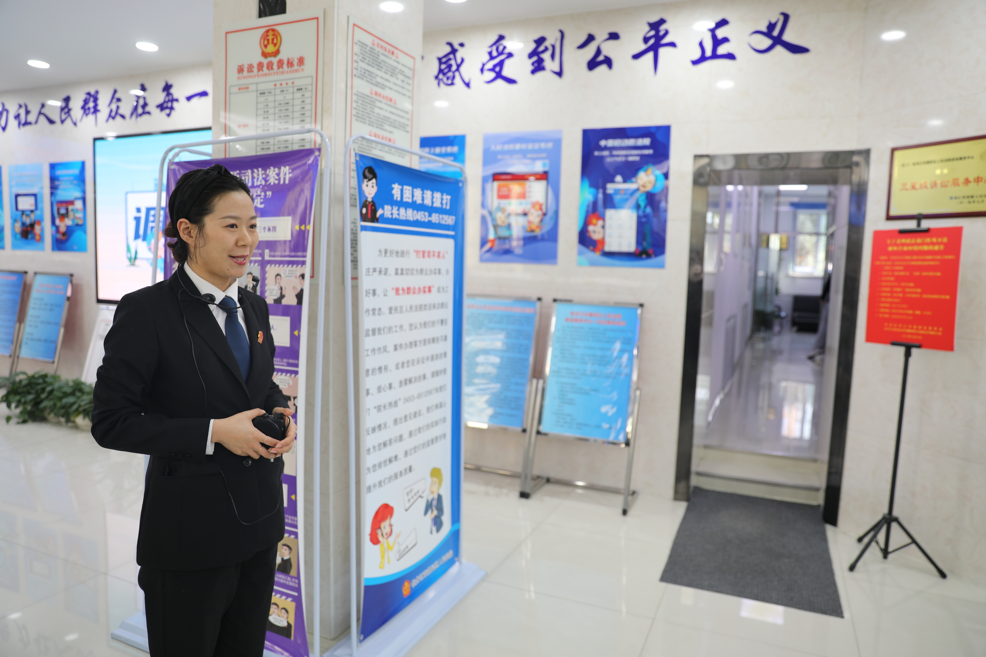 跟随镜头,大学生们首先参观了法院的诉讼服务中心,在这里,讲解员为大学生们介绍了法院的诉讼服务流程、便民利民举措以及现代化诉讼方式。随后,同学们参观了司法警察大队警务指挥中心、法官承诺墙、家事审判法庭以及科技审判法庭等地,了解了法院各部门的职能作用、文化建设以及荣誉成果,感受浓厚法治氛围。