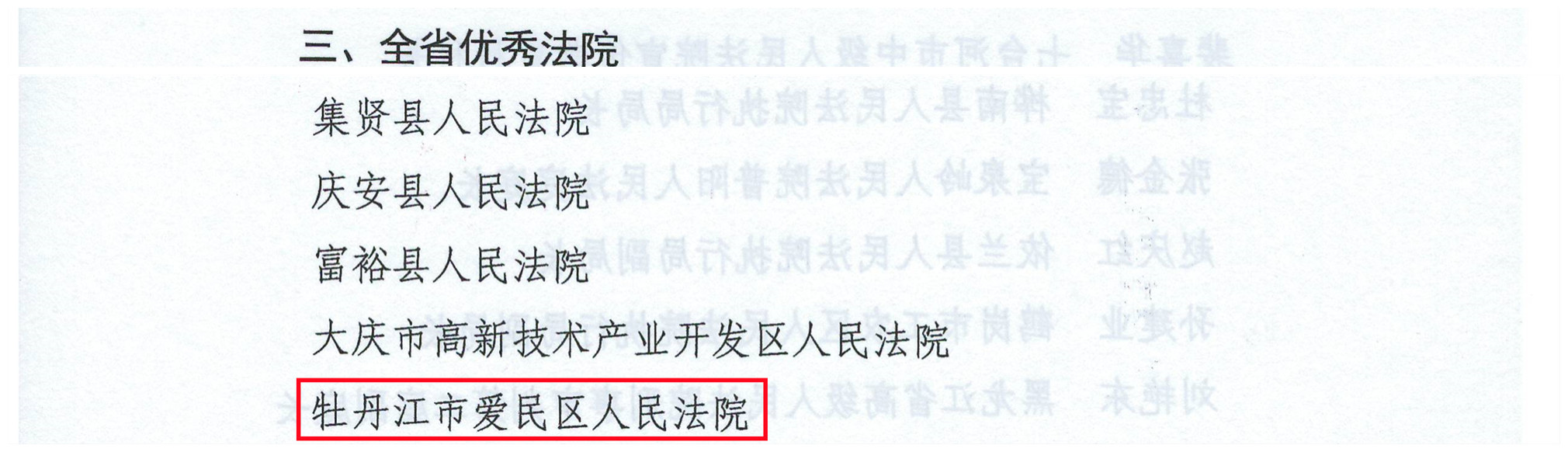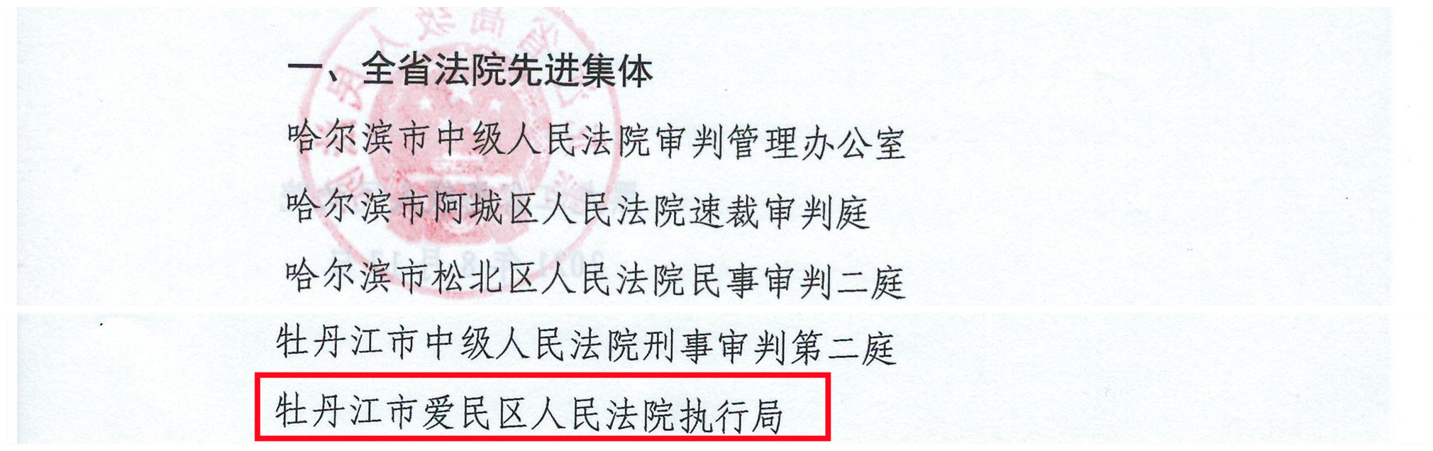 为表彰先进、激励队伍、鼓舞士气、促进工作,日前,黑龙江省高级人民法院作出关于表彰全省法院先进集体、先进个人、优秀法院、优秀法庭和优秀法官的决定,牡丹江市爱民区人民法院被授予“全省优秀法院”称号、执行局被授予“全省法院先进集体”称号。