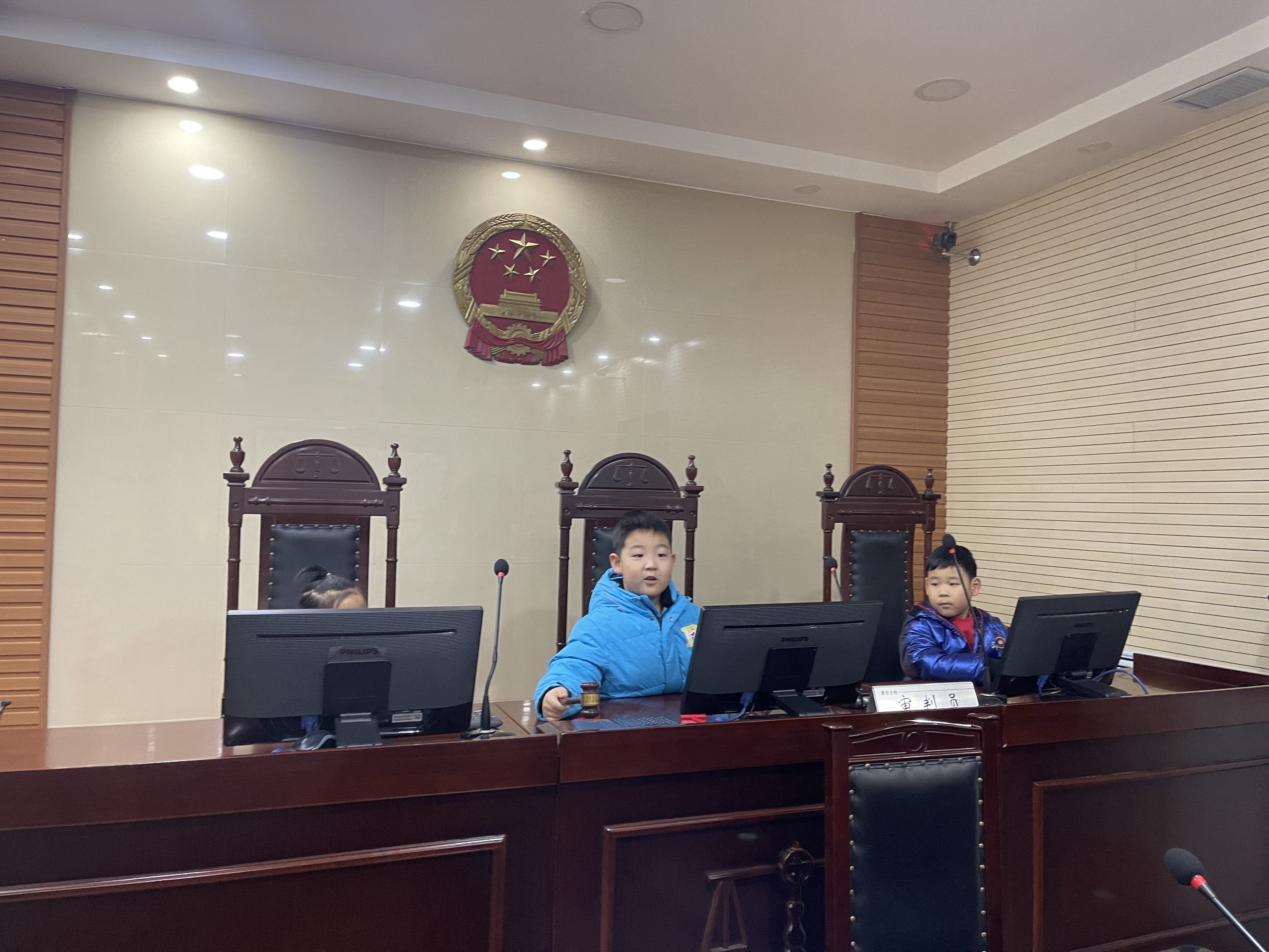 在讲解员的引导下,小朋友们参观了法院诉讼服务中心、审判法庭等场所。在诉讼服务中心,小朋友们了解到“法”字的含义、宪法在我国法律中的地位、法院的工作职责等知识。随后,小朋友们参观了审判法庭,解说员讲解了法徽、法袍、法槌等的寓意,让他们受到了生动、形象的法治教育。