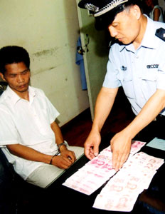29日下午3时许,上海铁路公安处上海站公安段民警孙华在上海站西广场巡视时,发现不远处一男青年与己对视时神色异常慌张,即上前对其进行盘问和检查。民警在这名男子携带的旅行包里发现一迭用报纸紧裹的硬物,非常可疑。经开包检查,发现报纸里裹着的是99版百元假人民币200张共计2万元,99版20元假币498张共计9960元。这些假币仿真度极高,仅凭手感、水印等很难发现疑点,唯一的破绽是:这些假币的尾数是同号。