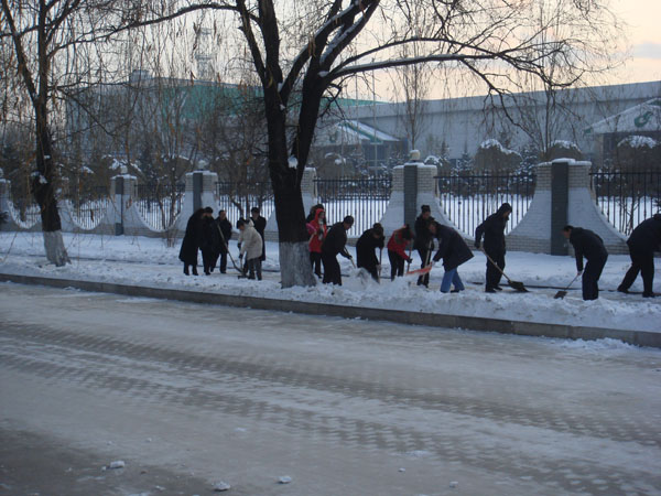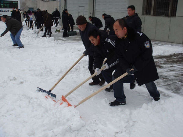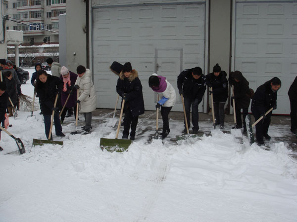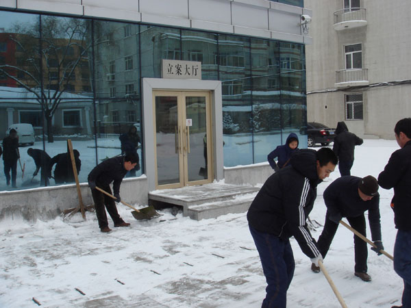 近日牡丹江地区迎来了近年来最大的一次降雪,此次降雪过程中牡丹江市区出现较大积雪,给人民群众的出行带来了不便,爱民区法院审判大楼的前后也存有大量积雪和结冰,给人民群众到法院进行诉讼带来了极大的不便,为了使人民群众不受降雪的影响,爱民区法院全体干警在党组书记、院长王菲同志的带领下,利用工休日在雪停后的第一时间里对积雪进行了清扫,使审判楼前后的积雪得到了及时的清理。在完成本院办公楼清雪工作的基础上,爱民区法院还积极参加了市区各主要街道的清雪工作,受到了辖区党委和人民群众的好评。