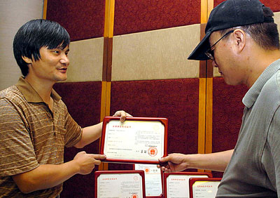 专利权持有人张百良(左)在向有关人员展示他近几年获得的专利证书。